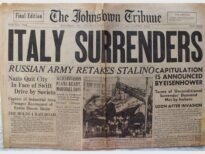 Primeira página do jornal Johnstown Tribune dando a notícia da rendição da Itália.